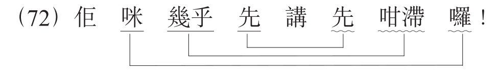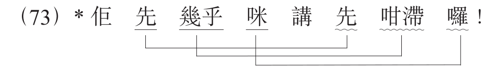 (68)的鏡像分佈的現象正好由(72)清晰地表達出來,圖中的連線顯示了“先……先、幾乎……咁滯、咪……囉”分別組成框式結構,在句子裏形成“套置”的現象,即事件類框式結構“先……先”套置於時間類框式結構“幾乎……咁滯”之中,而時間類框式結構又套置於焦點類框式結構“咪……囉”之中。
