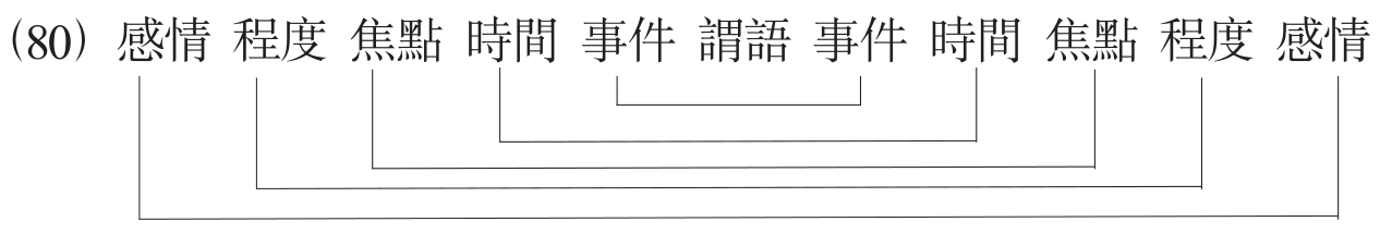根據上述的討論,後置成分(助詞)呈現了(66)的詞序,至於對應的前置成分,剛好跟後置成分的詞序倒過來,形成鏡像分佈。以謂語作為核心,謂語的兩側分別是框式結構的前置成分和後置成分,並且形成套置現象,在內的套在在外的之中,正如(80)所顯示的詞序。由於情態、疑問、祈使三類框式結構不會同時出現,為了方便表述,這三類框式結構在下圖用“程度”統一來代表(見本書第十章的討論)。