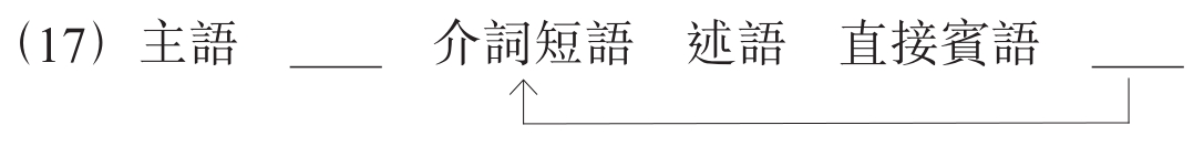 形成普通話的(12)和粵語的(14)這些與格句的“變體”,方法如下:介詞短語進行移位,移動到述語之前的位置,如(17)。介詞短語移位後的落腳點,應該是“謂語 2 ”之上,“謂語 1 ”之下的位置,即下圖代表“謂語 1 ”的空位“_”和述語之間的地方。 1 假如普通話的述語不動,就形成了“主語+介詞短語+述語+直接賓語”這樣的詞序,即上述例子(12)。