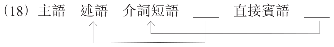 假如粵語述語進行移位,離開原來的位置,跨越介詞短語,移動到“謂語 1 ”的層次,如(18)所示,就能形成“主語+述語+介詞短語+直接賓語”這樣的詞序,即上述例子(14)。
