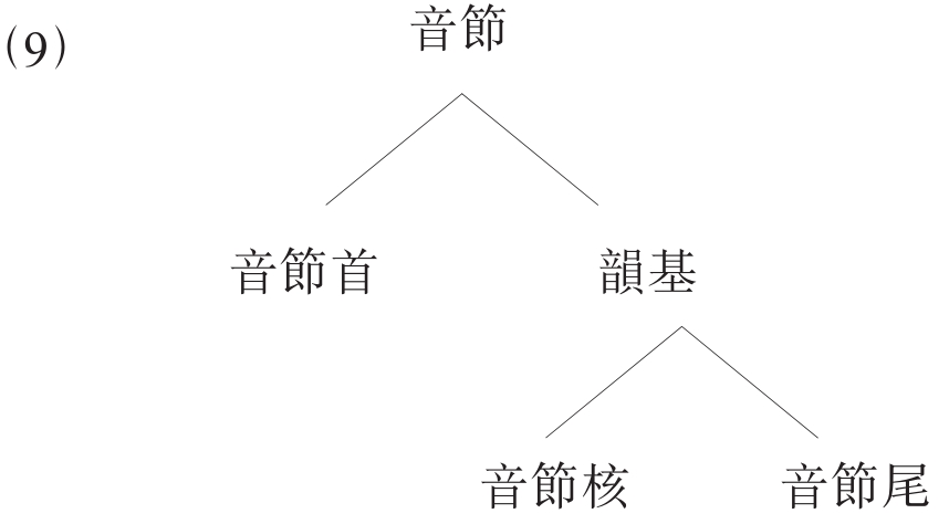 粵語的元音、輔音、聲調可以組合為“音節”(syllable)。所謂“音節”,就是一個發音的單位,音節結構就是上述的成分,按照一定的排列方式組合起來的結構。按照目前音系學的分析方法,音節可以劃分為“音節首”(onset)和“韻基”(rime)兩大部分,而韻基可以進一步劃分為“音節核”(nucleus)和“音節尾”(coda)。音節首,又稱為“聲母”,是元音前的輔音,有些音節有音節首,有些沒有。韻基,又稱為“韻母”,是音節首後面的部分,由音節核和音節尾構成。音節核是組成韻基的重要成分,也是組成音節的重要成分,往往不能缺少,而通常由元音來組成。用傳統漢語音韻學的術語來講,音節核又稱為“韻腹”。音節尾是音節核後面的輔音,是可有可無的部分,並非必要的部分。用傳統漢語音韻學的術語來講,音節尾又稱為“韻尾”。粵語的音節結構可以用圖(9)來表示。