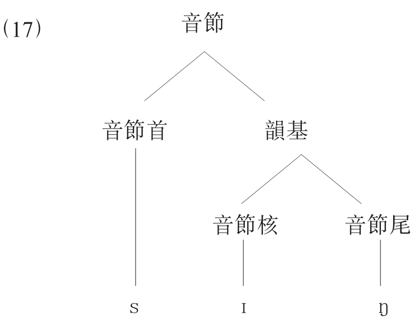 以粵語“星”[sɪŋ 55 ]為例,這個音具備音節內各個部分,可以用(9)的圖來描述,如(17)。這個圖只表示音段的成分(segmental),聲調屬於超音段的成分(suprasegmental),不在這個圖的範圍內。