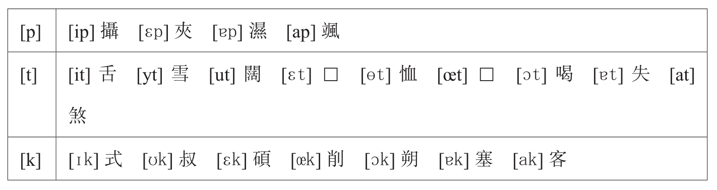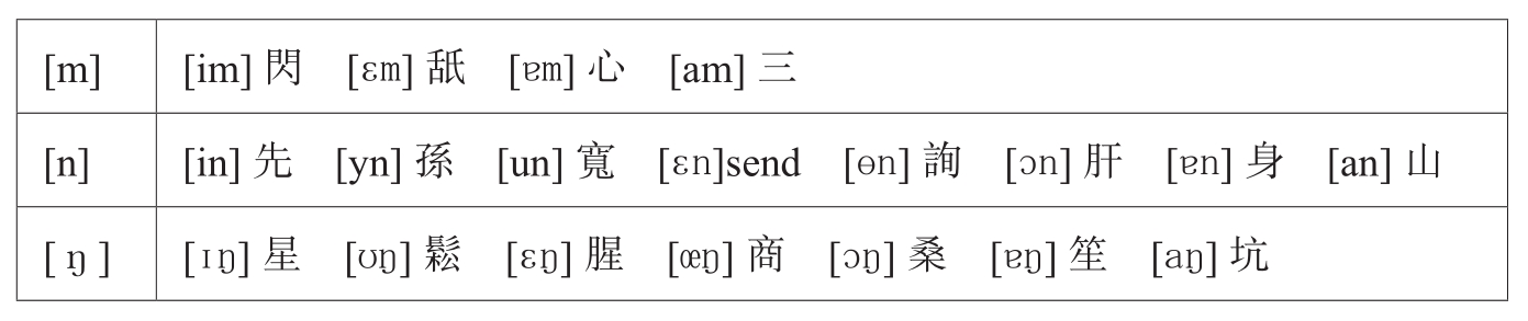能夠用作音節尾的輔音,包括鼻音[m]、[n]、[ŋ]和塞音[p]、[t]、[k],如(13)和(14)各例。這兩套音節尾輔音,非常工整,即有相同發音部位的[m]和[p](雙脣音),[n]和[t](齒齦音),[ŋ]和[k](軟顎音)。按照傳統漢語音韻學的分析,以塞音作為音節尾的音節,稱為“入聲”。(14)的各個例子,也稱為“入聲字”。“□”表示所謂“有音無字”的情況,如“[ɛt 55 ]都唔敢[ɛt 55 ]”(連吭也不敢)的“[ɛt 55 ]”;睡覺時所發出的“[kœt 21 ][kœt 35 ]聲”。至於[ɛn],可見於作為外來詞的“send”。